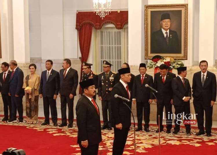 JAKARTA, Lingkar.news Presiden Joko Widodo melantik Hadi Tjahjanto sebagai Menteri Koordinator Bidang Politik, Hukum dan Keamanan (Menko Polhukam) serta Agus Harimurti Yudhoyono (AHY) sebagai Menteri Agraria dan Tata Ruang/Kepala Badan Pertanahan Nasional (ATR/BPN) di Istana Negara, Jakarta, pada hari ini Rabu, 21 Februari 2024.