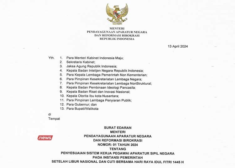 Pihaknya juga telah menerbitkan Surat Edaran (SE) Menpan RB Nomor: 01 Tahun 2024 Tentang Penyesuaian Sistem Kerja Pegawai Aparatur Sipil Negara pada Instansi Pemerintah setelah Libur Nasional dan Cuti Bersama Hari Raya Idul Fitri 1445 H.